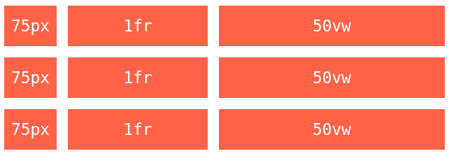 У цьому прикладі (результат вище) ми подаємо три значення для властивості grid-template-columns. Ці три значення вказують функцію визначення розміру доріжки, яка буде використовуватися для кожного з трьох стовпців. Якщо ми збільшимо, скажімо, перше значення, перший стовпець стане ширшим.